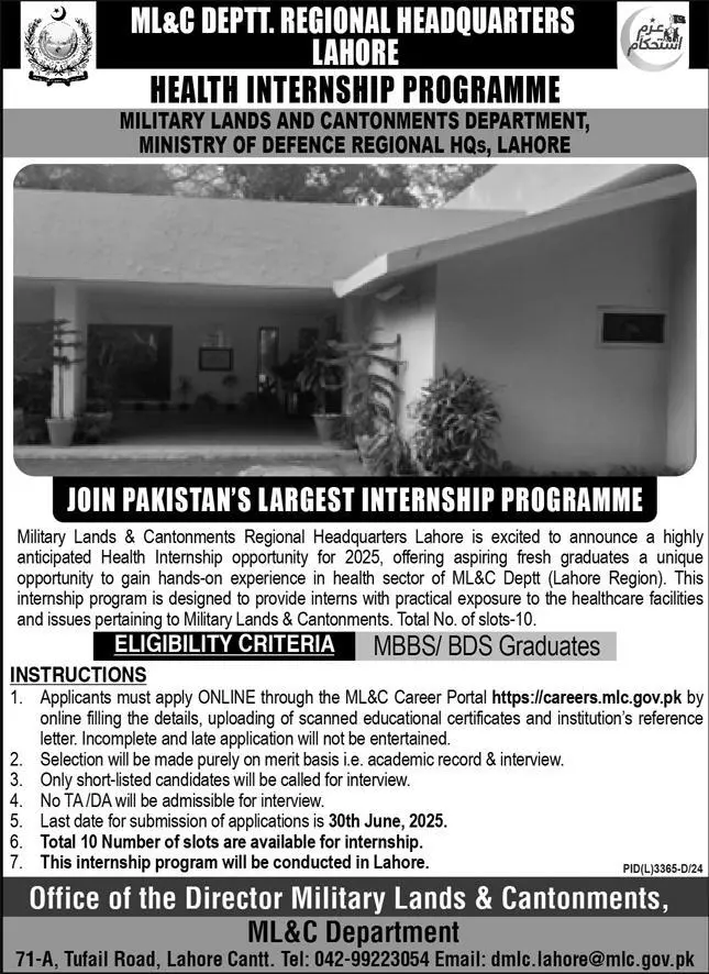 Military Lands & Cantonments (ML&C) Regional Headquarters Lahore has announced an exciting Health Internship Program for fresh graduates in 2025. This program offers an excellent opportunity for MBBS and BDS graduates to gain hands-on experience in healthcare facilities under the ML&C department.